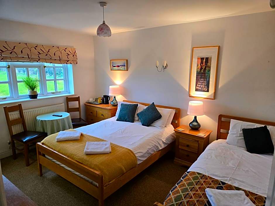 This room has a double bed plus a full-size single bed, so it is suitable for parties of 1, 2 or 3 people. The room has an en suite shower, flat-screen TV, tea and coffee facilities and a view of the fields.